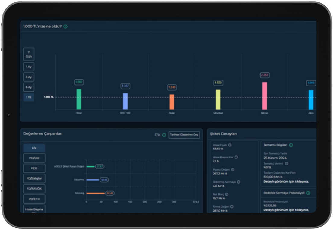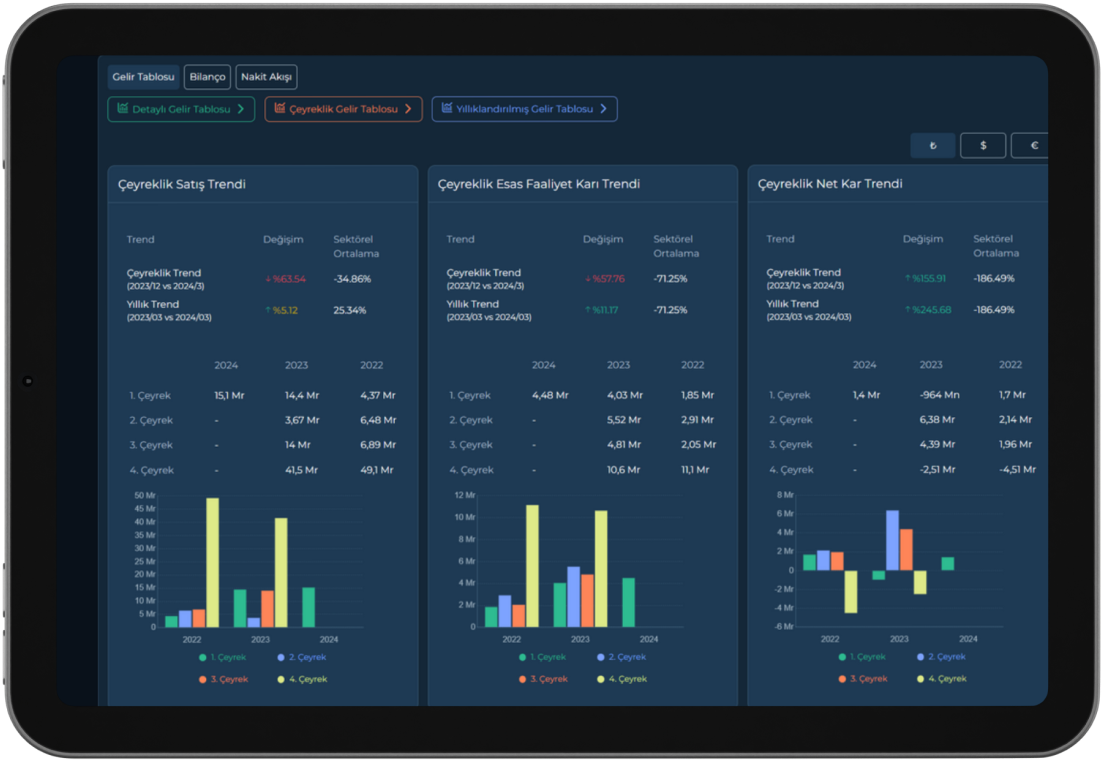 Detaylı Finansal Tablolar ve USD-EURO Bazlı GösterimPlatformumuz, son 16 çeyreklik veriyi içeren bilanço, gelir tablosu, çeyreklik gelir tablosu, yıllıklandırılmış gelir tablosu ve nakit akış tablosu gibi finansal tabloları ve bu tabloları analiz edebilmeniz için kapsamlı grafik ve analiz araçları sunar. Bu tabloların trend ve dikey analizlerini yaparak şirket performansını derinlemesine inceleyebilirsiniz. Finansal tablolar, Kamuyu Aydınlatma Platformu'nda (KAP) açıklandıktan hemen sonra platformumuza yansır ve TL, USD veya EURO bazlı olarak tek tıkla görüntülenebilir.