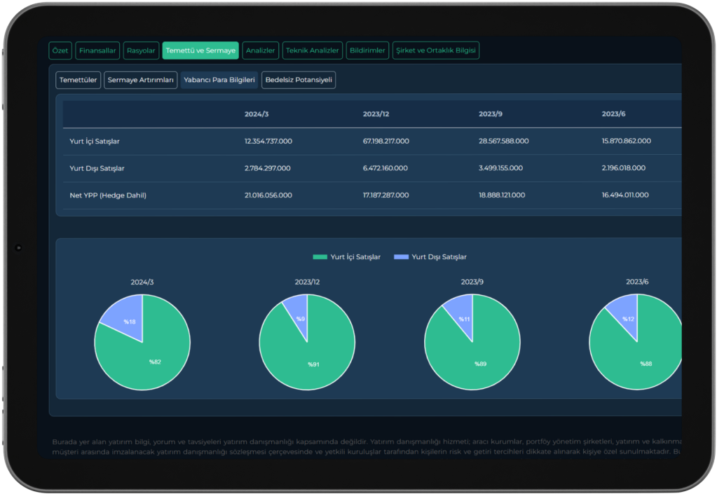 Sermaye Artırımı, Temettü ve Yurt Dışı Satış VerileriPlatformumuzda, şirketlerin ortaklık bilgileri, yurt içi ve yurt dışı satış verileri, net yabancı para pozisyonu gibi kritik dipnot finansal bilgilerine kolayca ulaşabilirsiniz. Ayrıca, temettü takvimi, temettü miktarı ve verimi gibi detaylı temettü bilgilerine erişebilir, yaklaşan sermaye artırımları takvimini takip edebilirsiniz. Bedelli ve bedelsiz sermaye artırımları ile bedelsiz potansiyeli hesaplamalarına ulaşarak, tarihsel verileri analiz edebilir ve daha bilinçli stratejik yatırım kararları alabilirsiniz.