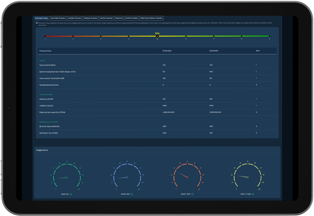 Finansal Oranlar, Hisse Çarpanları, Piotroski F-Skor ve Değerleme MetrikleriPlatformumuz, F/K, PD/DD, PEG, PD/EFK gibi hisse çarpanlarını ve 70'ten fazla mali oranı sektörel kıyaslamalarla ve geçmiş verileriyle birlikte sunar. Ayrıca, Piotroski F-Skoru, WACC, ROIC, Beta, Hacim gibi kritik değerleme metriklerini hesaplayarak, şirketlerin finansal durumlarını kapsamlı bir şekilde analiz etmenizi sağlar. Bu metrikler, şirketlerin gelecekteki başarısını tahmin etmenize yardımcı olur.