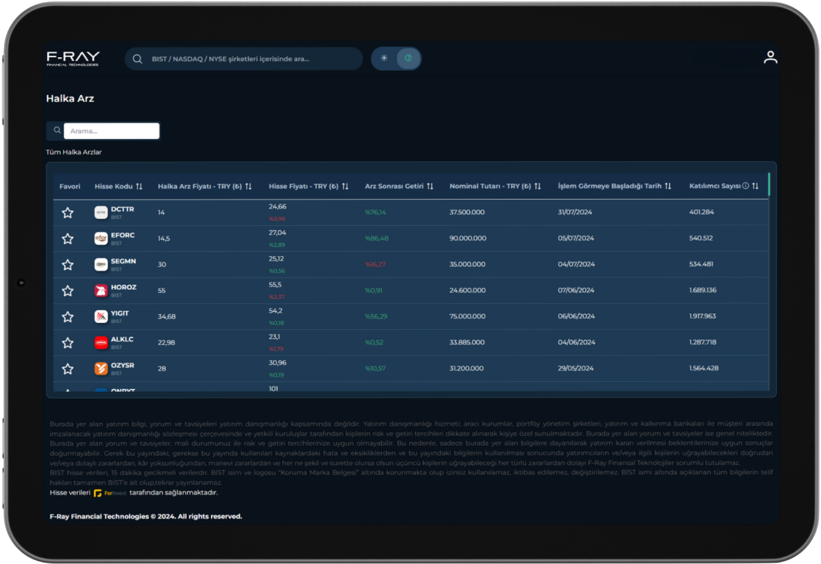 Halka ArzPlatformumuzda halka arz hisselerini, arz öncesi katılım bilgileri ve arz sonrası getiri verileriyle birlikte tarihsel olarak bulabilirsiniz. Bu sayede halka arz süreçlerinden haberdar olup stratejik yatırım kararları alabilirsiniz.