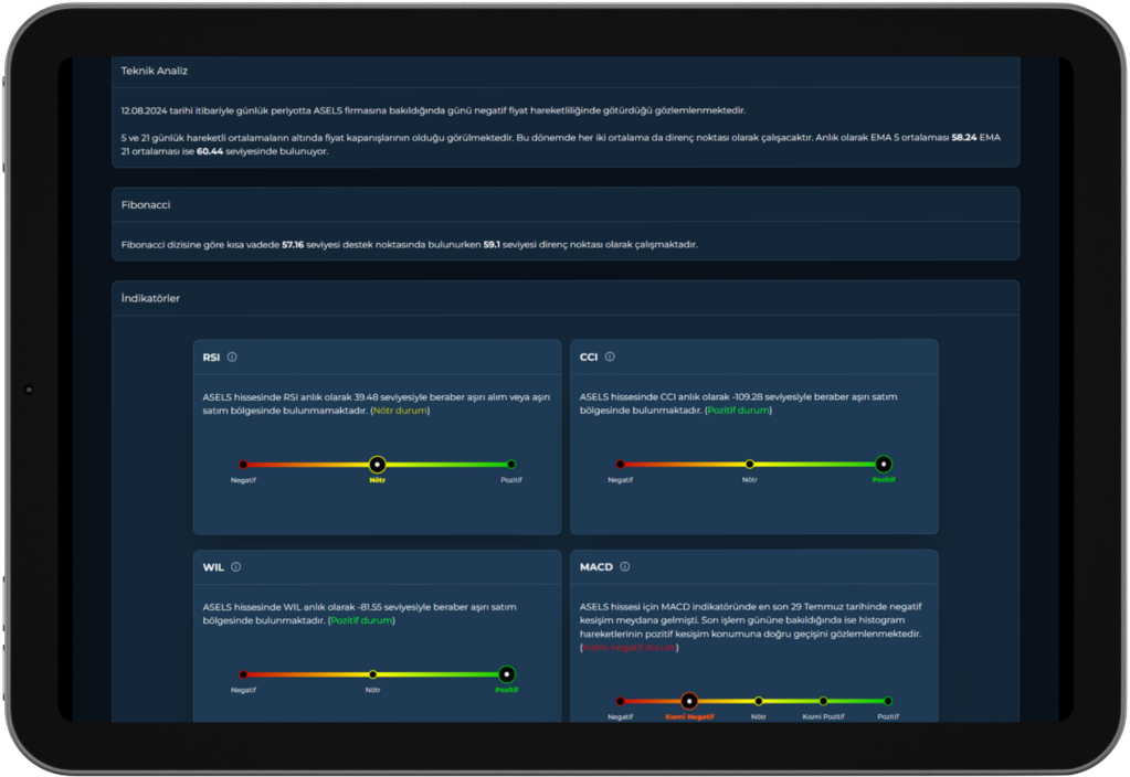 Teknik AnalizPlatformumuz; BIST, NASDAQ ve NYSE şirketlerine ait 5 ve 21 günlük hareketli ortalamalar, Fibonacci destek/ direnç seviyeleri, RSI, CCI, WIL ve MACD gibi güçlü teknik indikatörleri açıklamalarıyla sunar. Bu indikatörler, hisse senetlerinin en uygun alım-satım zamanlarını belirlemenize yardımcı olur. Hisse senetlerinin aşırı alım ya da satım durumlarını ve mevcut trendin yönünü doğru bir şekilde analiz etmenizi sağlar.